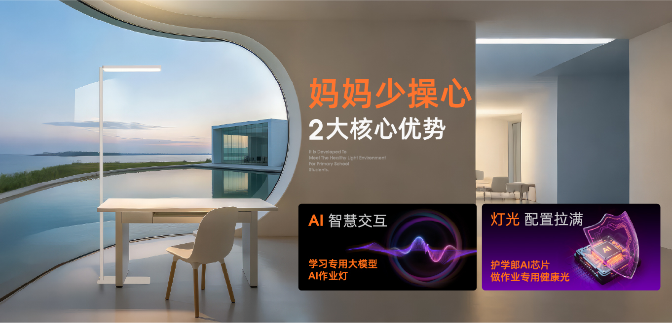 紫光激发全光谱:通过定制紫光芯片实现 真0蓝光危害,光谱接近自然太阳光(400~700nm),大幅降低视觉疲劳124。 独创Deepseek助学:场景微调技术,家庭新成员,自研Deepstudy深度学习算法。 小夜灯设计:首次采用1800K金黄光小夜灯模式,更助睡眠。